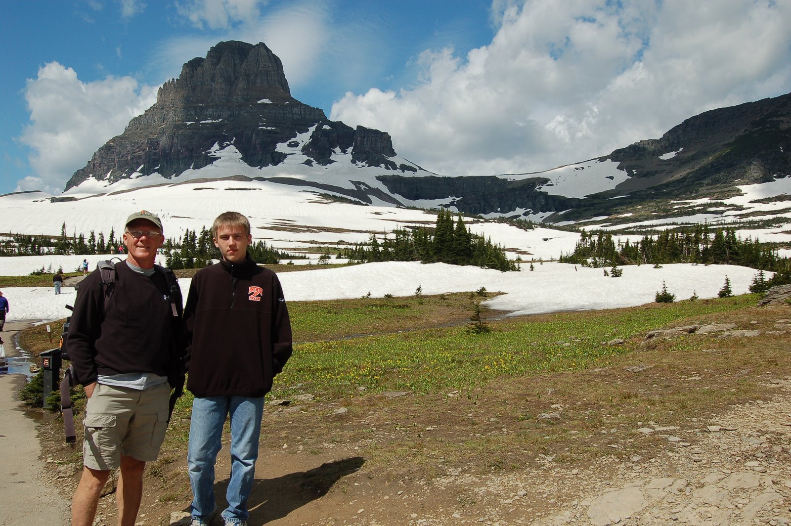 Kyle and Glen at Logan Pass. Behind them you may see some people hiking on the trail(?) to Hidden Lake Overlook. It is snowcovered at the moment, and some people have had skis out there.