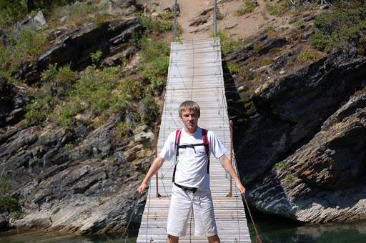 We walked back to the ranger station where we had a lunch break, and then started on the Waterton Lakeshore Trail to walk back to where we had started. (9.7 miles) This trail was a bit disappointing when compared to the others we have done. It was somewhat overgrown in places, although rangers lead an “international peace” hike on the trail twice a week. We were hoping for more views of the lake, but weren’t rewarded. There were some interesting suspension bridges on the trail. I decided I would never make it in Africa on those long ones that are in all the adventure movies. Especially when the bad guys are shooting and the boards break! Kyle, on the other hand, thought longer ones would be cool.