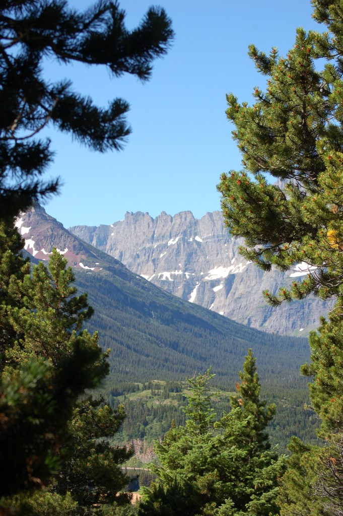 View into the Many Glacier section of the park from the Apikuni Falls trail.