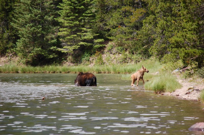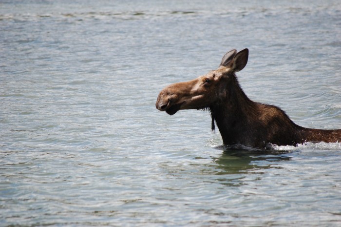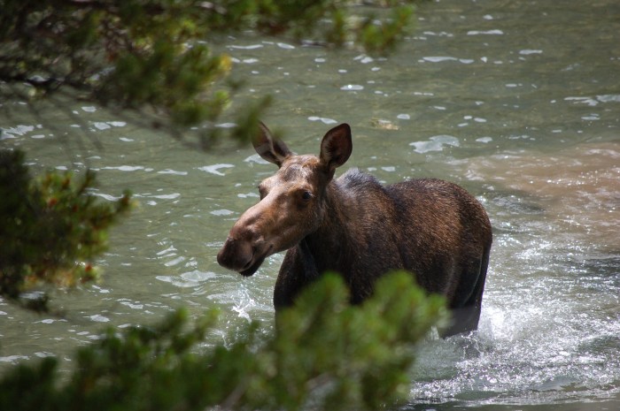 When we finished the Apikuni Falls trail, we transitioned to the Swifturrent Pass Trail on our way to Red Rock Falls. We hiked past Fishercap Lake and heard there was a moose there, so we took the side trail to the lake to see if it might still be there. Not only was there a moose…there were three: two cows and a baby!