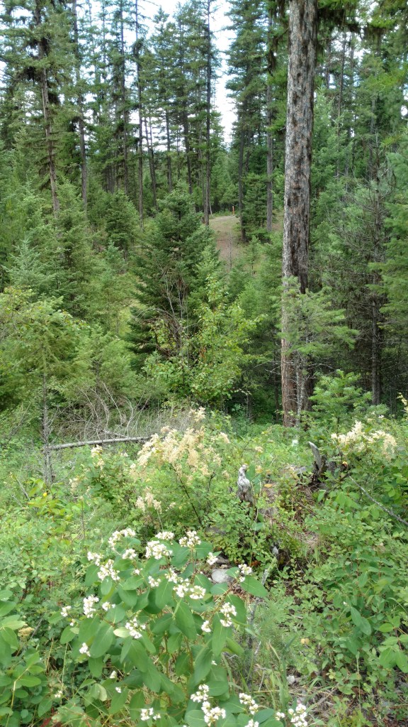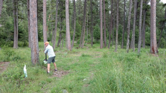 After a few minutes of bushwhacking, Glen actually finds signs of a course. Well, sort of. As you can see by the pictures, Montana disc golf isn’t for the faint of heart. Tucked into the woods was a course that some local disc golf fanatics cobbled together. The baskets were made from fence posts that were about 8 inches in diameter, propped up by circular piles of rocks, and made visible by the painted coffe cans that were stacked around the posts. The boxes had logs pointing out the direction of the hole while rocks on the ground had the hole number painted or scratched on them.