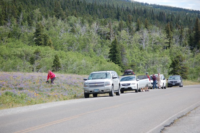 These two bears were hidden in the underbrush or wildflowers on the road into Many Glacier. We decided to take photos and not tag them or race them to the goal. 🙂 That way we all win the game.