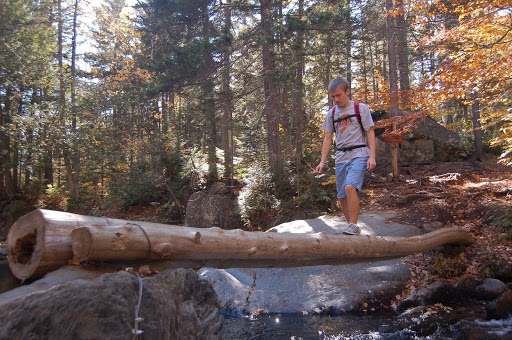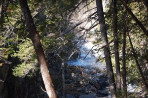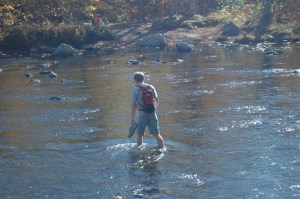 Kyle fording the VERY cold Pleasant River. You have to cross it both coming and going to Gulf Hagas. So, if you want to do this hike, bring some sandals, crocs, or water shoes. The water is often much higher in the spring and summer. We had only ankle to knee deep water.