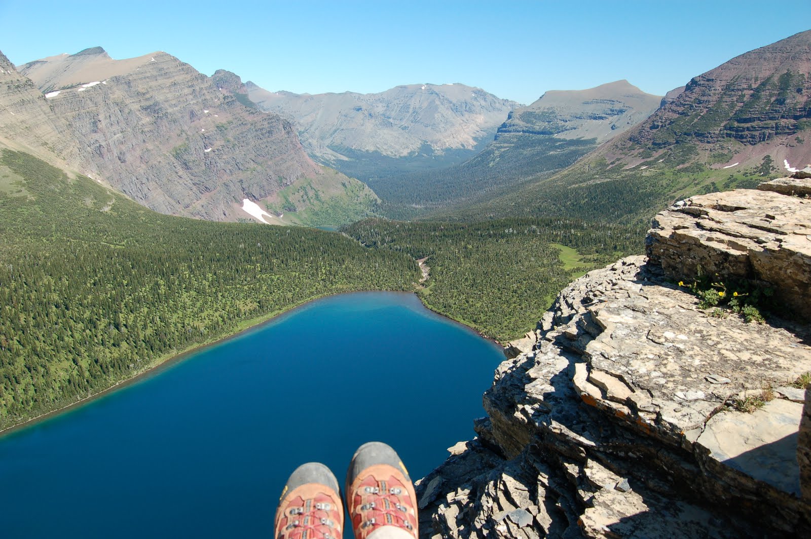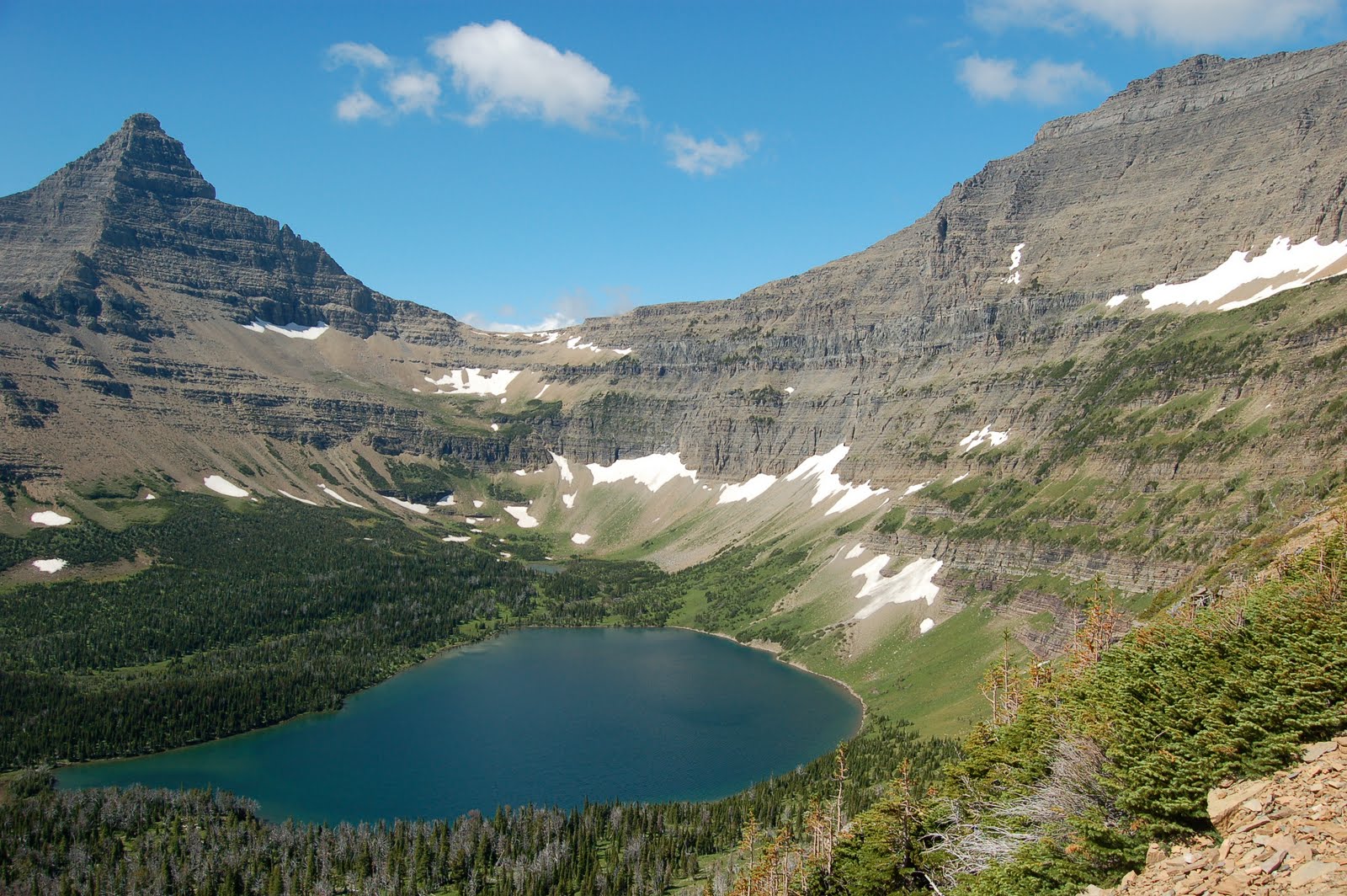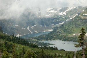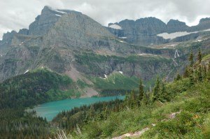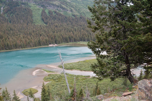 This is a view of Grinnell Lake. It lies beneath Grinnell Falls, which flow from Grinnell Glacier. Have you noticed how everything is named Grinnell? Well, it was all named after George Bird Grinnell. He was an environmentalist that explored the area and was instrumental in getting the area named a national park.