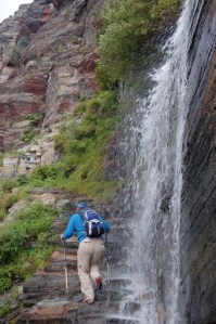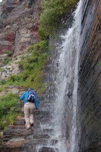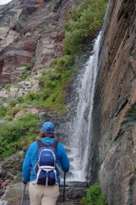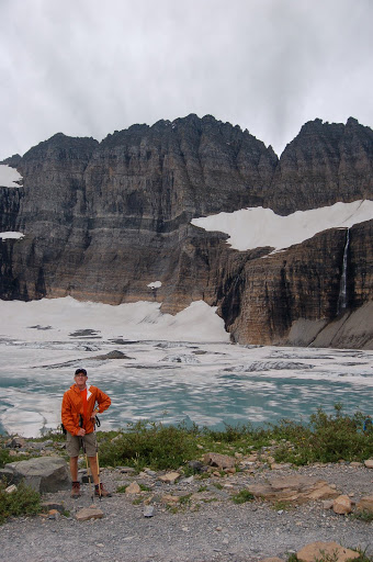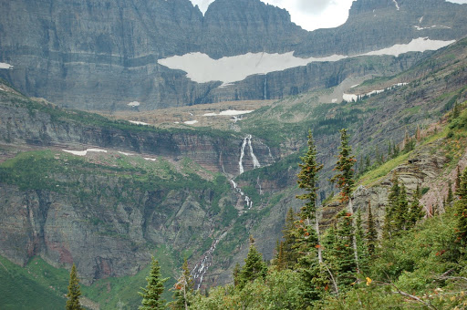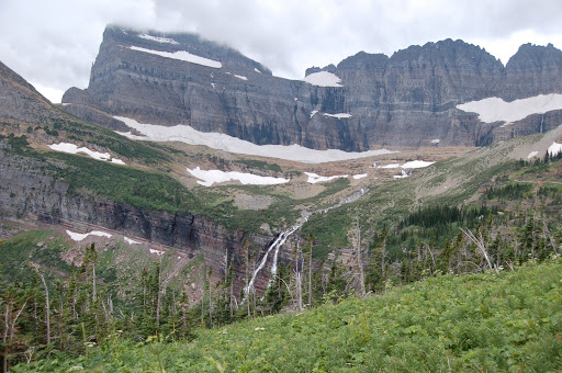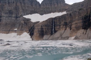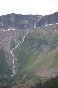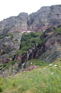 In this photo above, you can see where we are headed. The large snow area at the top is Salamander Glacier. Just below it, (hidden) is Grinnell Glacier. We will be going above that waterfall and almost to the rock wall below Salamander Glacier. The waterfall is Grinnell Falls.