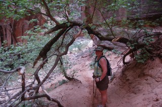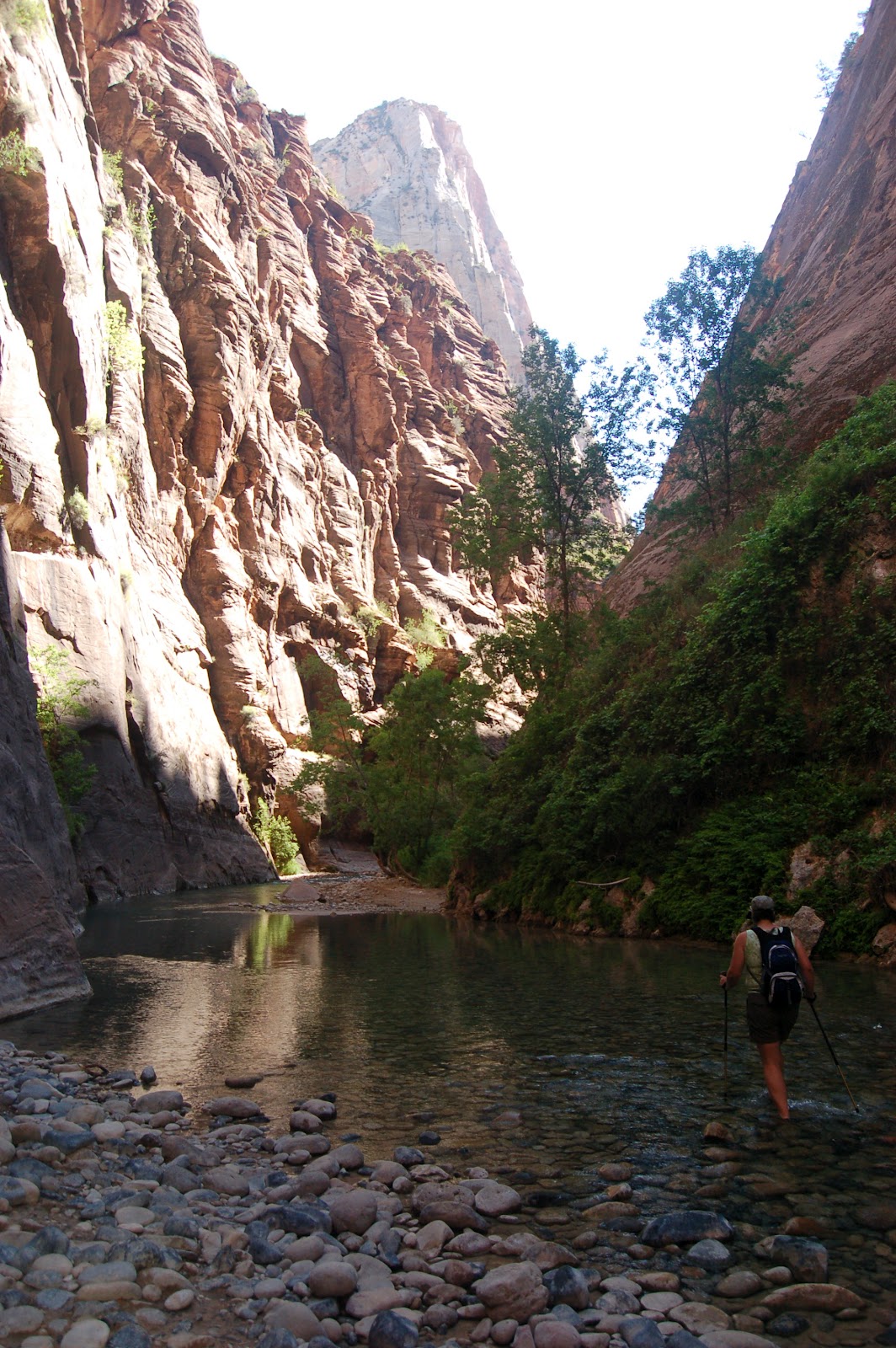 On our two previous trips, we had never made it as far upstream as the actual “narrows”, and we wouldn’t this time either. That part is close to the trailhead, many miles upstream. We didn’t have a permit, or the desire to camp out overnight on this walk. We walked upstream for two hours,  and found a great little picnic spot. Then, we walked downstream for two hours. That kind of a hike uses muscles we didn’t know we even had. Thank goodness for hiking poles. (Terry still fell in once…and not gracefully) Rocks are slippery when wet.