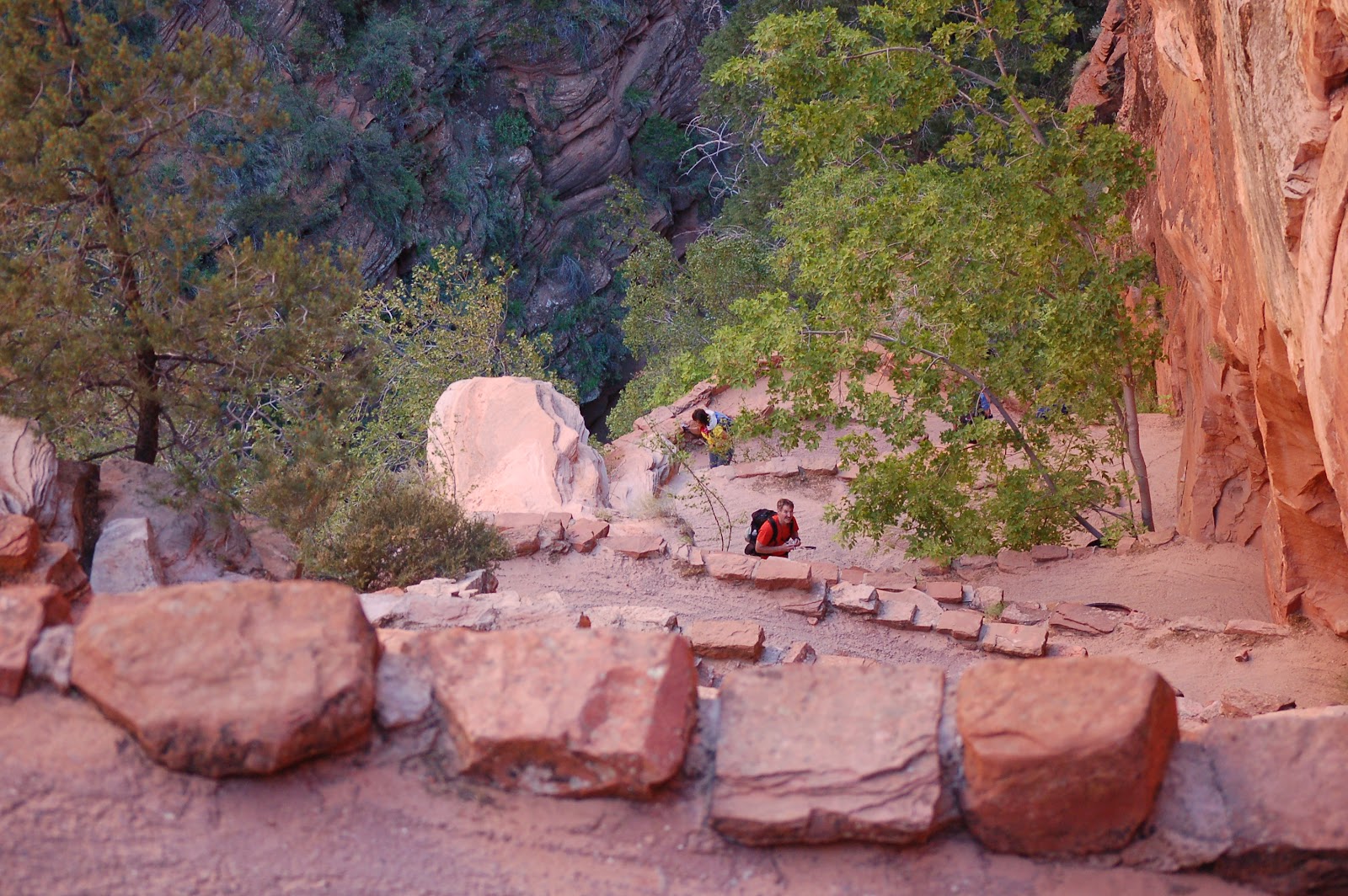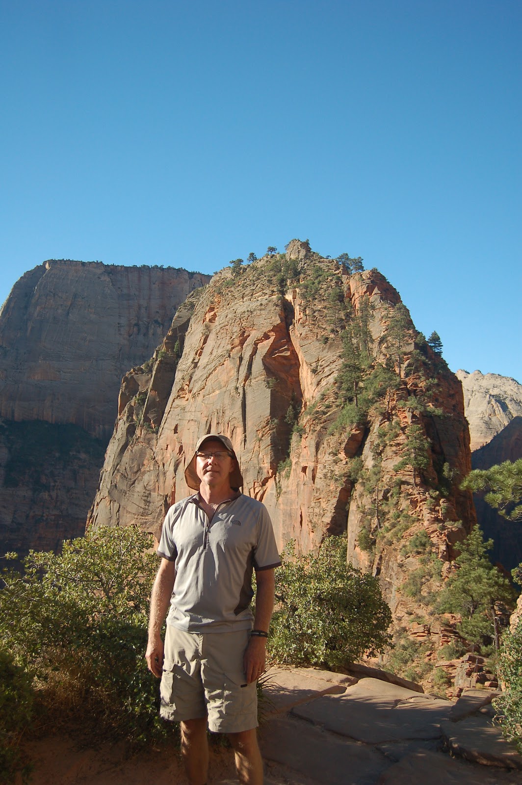 This time, we got up at 5:15 in order to beat the predicted 103 degree temperature, and were some of the first people on the trail. We climbed up the trail on some switchbacks called “Walter’s Wiggles” after the man who designed and built them. Dropping Glen’s big pack at Scout’s Lookout (more on that later) we took Terry’s small pack for water and continued on Angels Landing and the first section of chains before we could think about it too much.