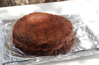 Transferring to our makeshift cake board, and ready to put the chocolate mousse filling between the layers.